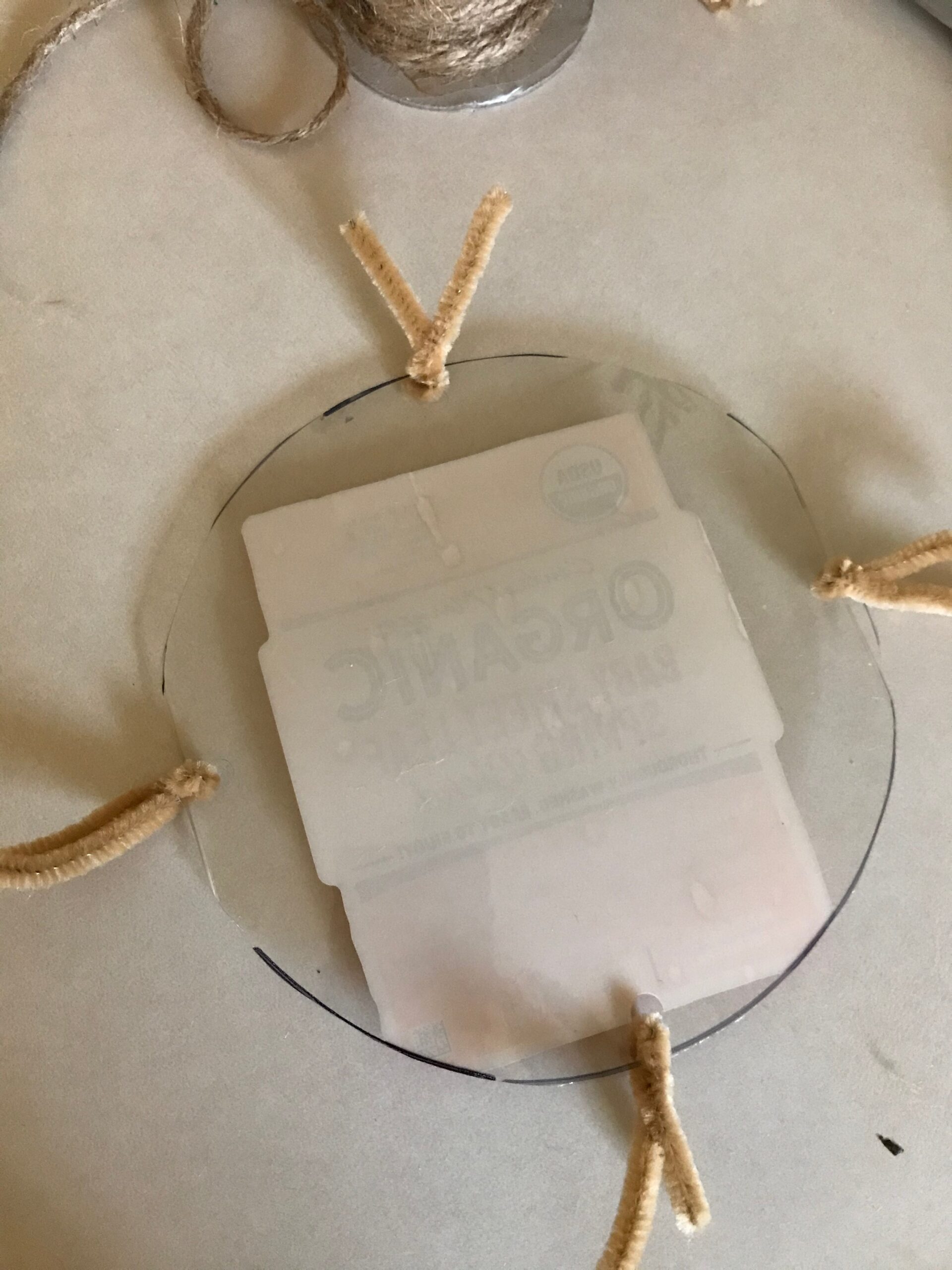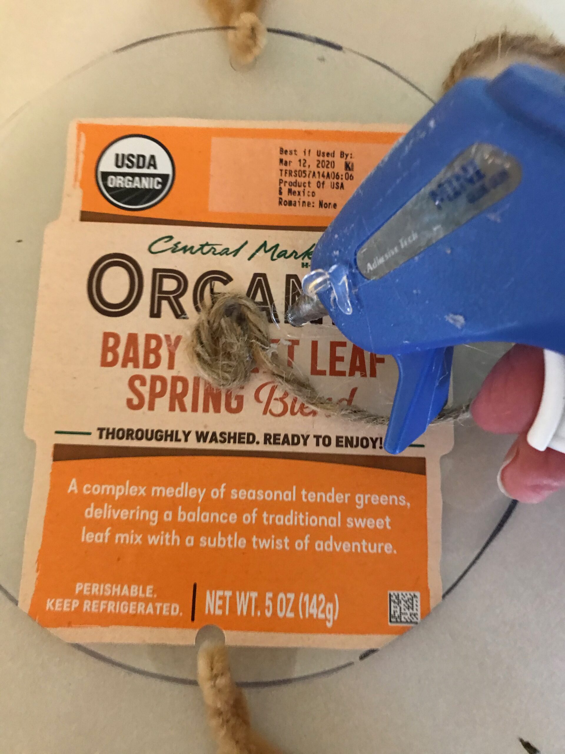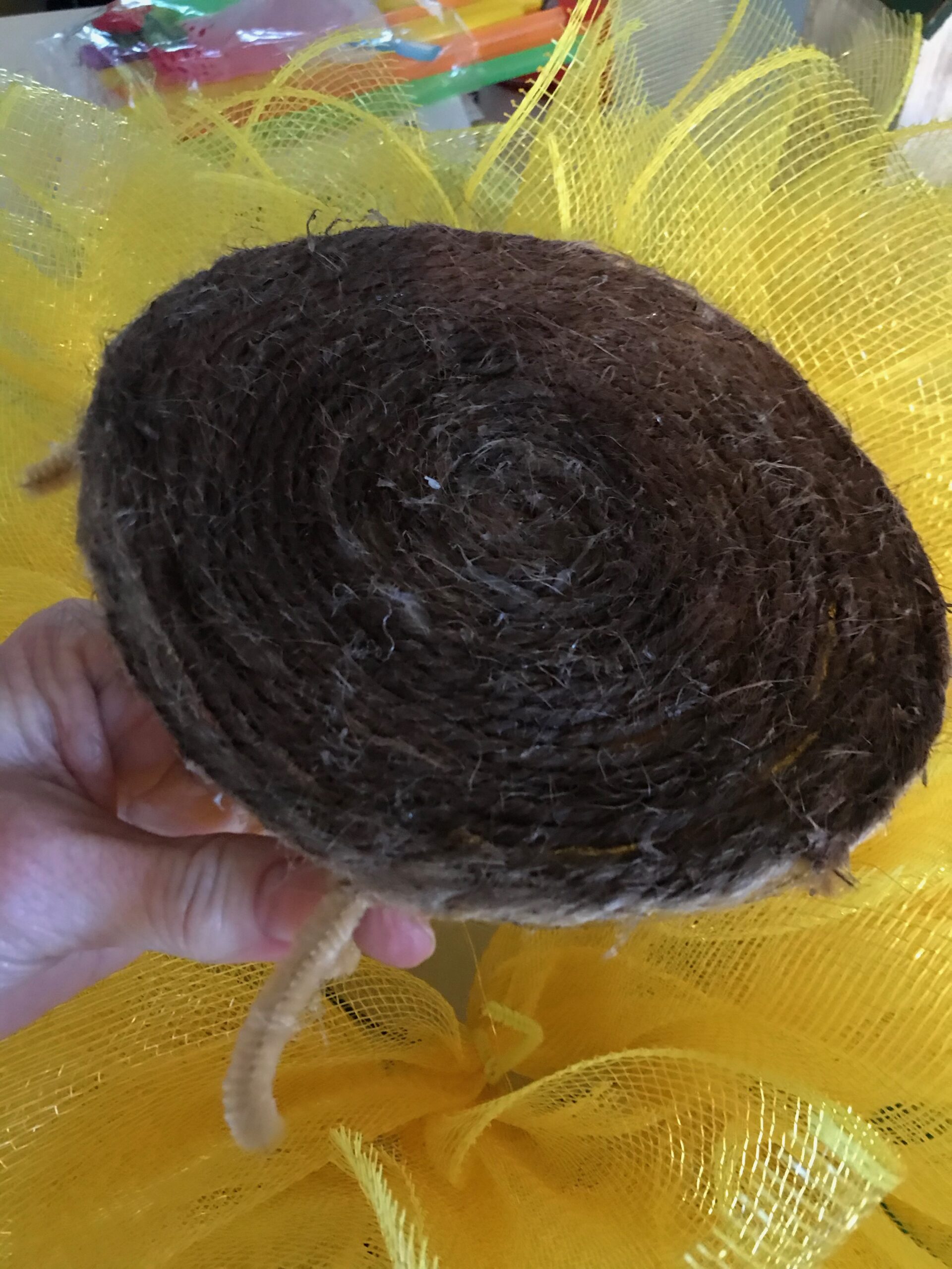 Glue the rope or jute in a circle, starting at the center working your way to the outer edge. Cover the top of the chenille stems that are attached to the plastic circle with jute.