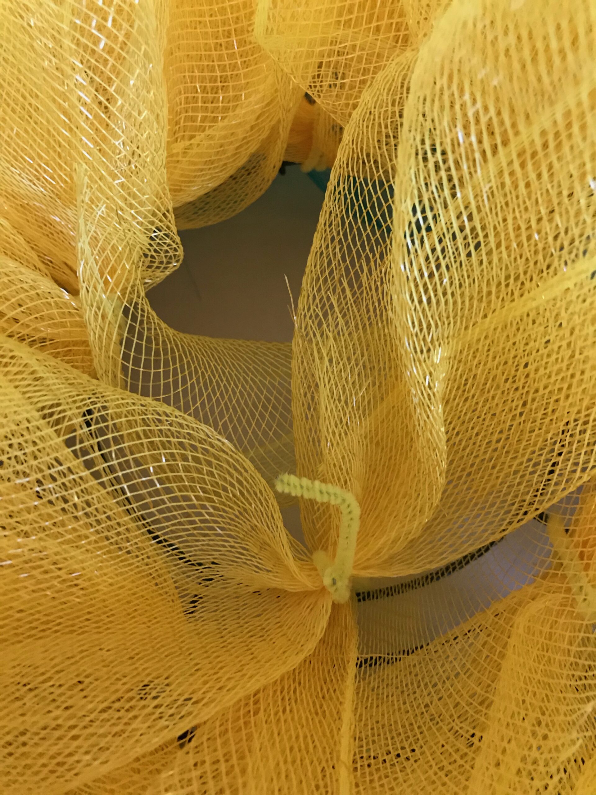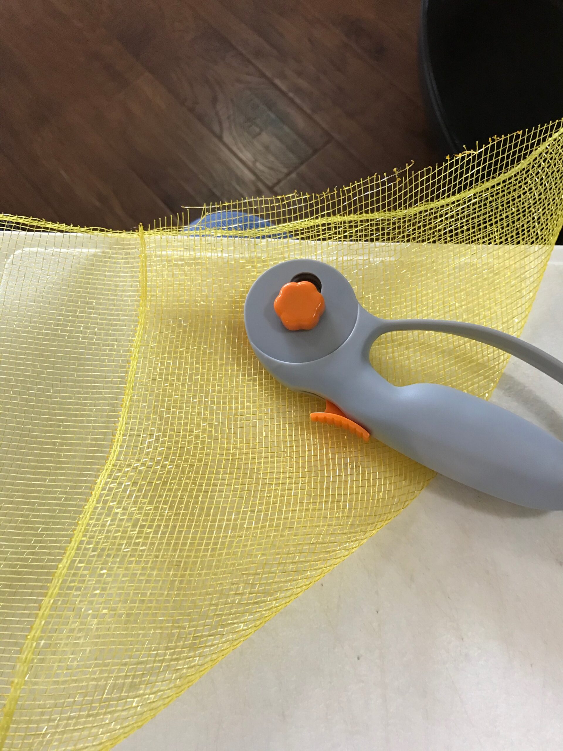 Cut the yellow mesh strips 10 inches wide and the green mesh 12 inch strips. I just cut the whole roll of yellow to 10” strips. You can make it as full as you want. I ended up removing some after I hung it up because I thought it was too “fluffy”. However, you can do you. You only need (7) 12” strips of the green.