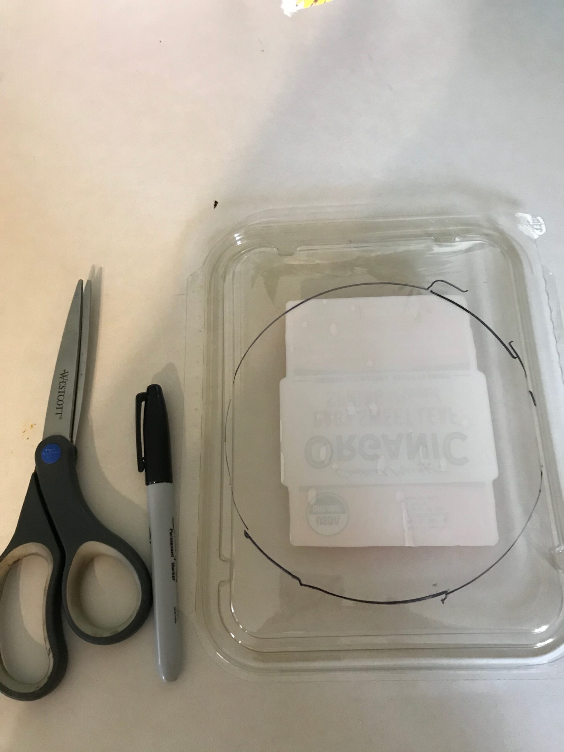 Find a thick piece of plastic. I used an empty salad container from my recycle bin. Cut a 6” circle from the lid. Pretend the plastic circle is a clock and punch 4 holes at 12, 3, 6 and 9:00 o’clock out on the circle.
