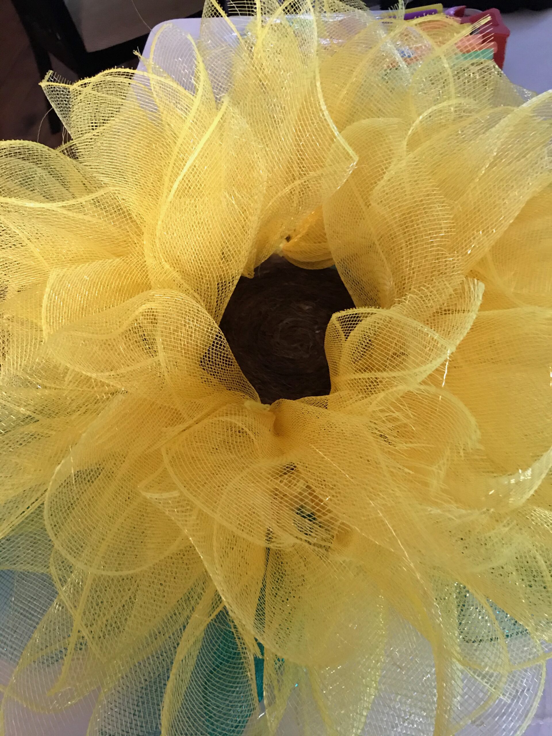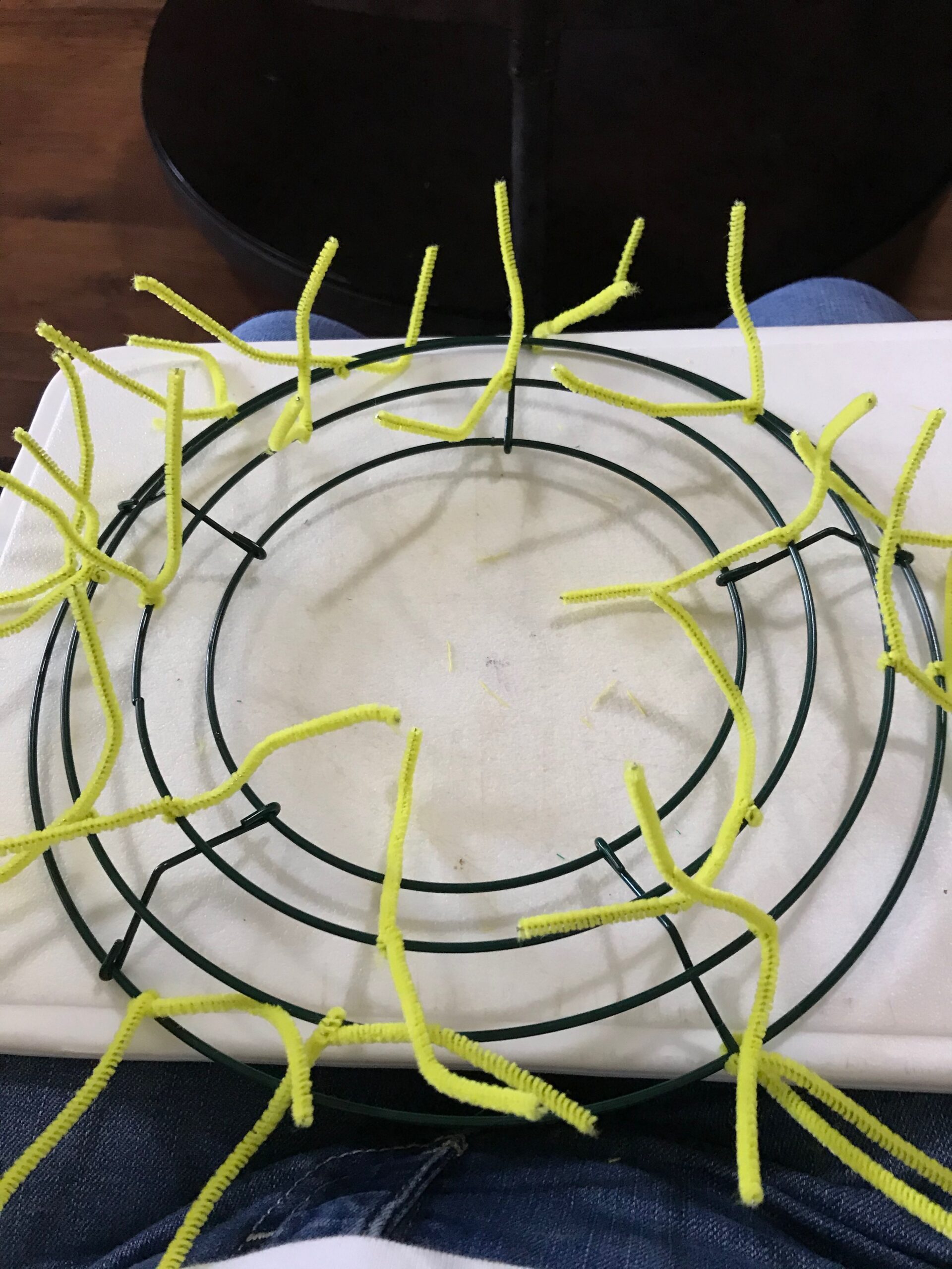 Now continue to attach the yellow “bow ties” to all of the chenille stems you’ve already put on your wire wreath form. Attach 14 on the outer wire on the green, 18 on the next wire, 14 on the next to center wire, and 10 on the inner wire. Lay the wreath aside and prepare your flower center.