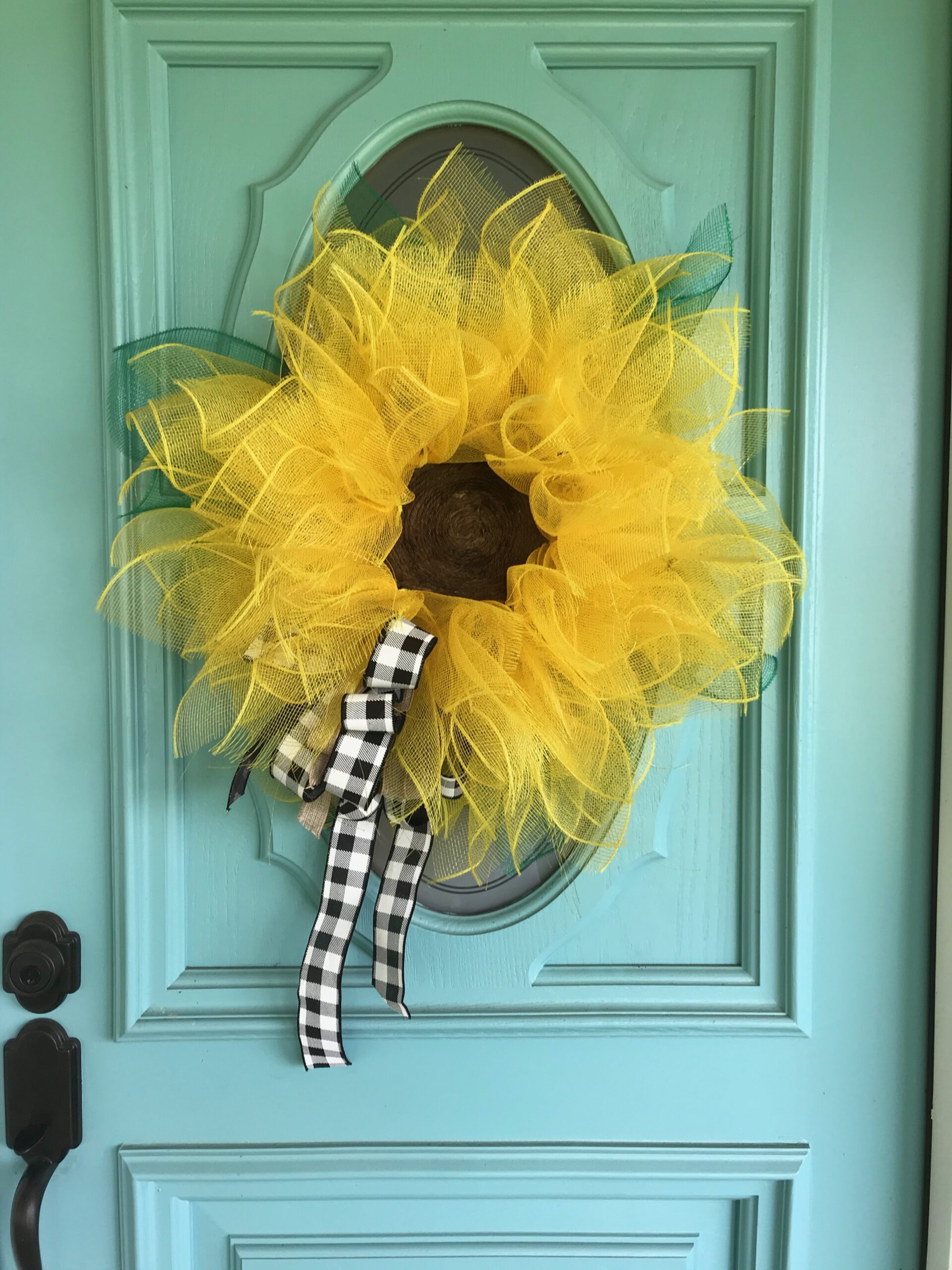 Do you need a little sunshine in your life? I do. That was the inspiration for this sunflower wreath. I decided to update my front porch for Spring with some happy. If you remember we couldn’t get a lot of supplies when the quarantine began. I had to order everything online. You may be able to get these supplies for less now. Here is how to DIY a cheap and easy sunflower wreath.