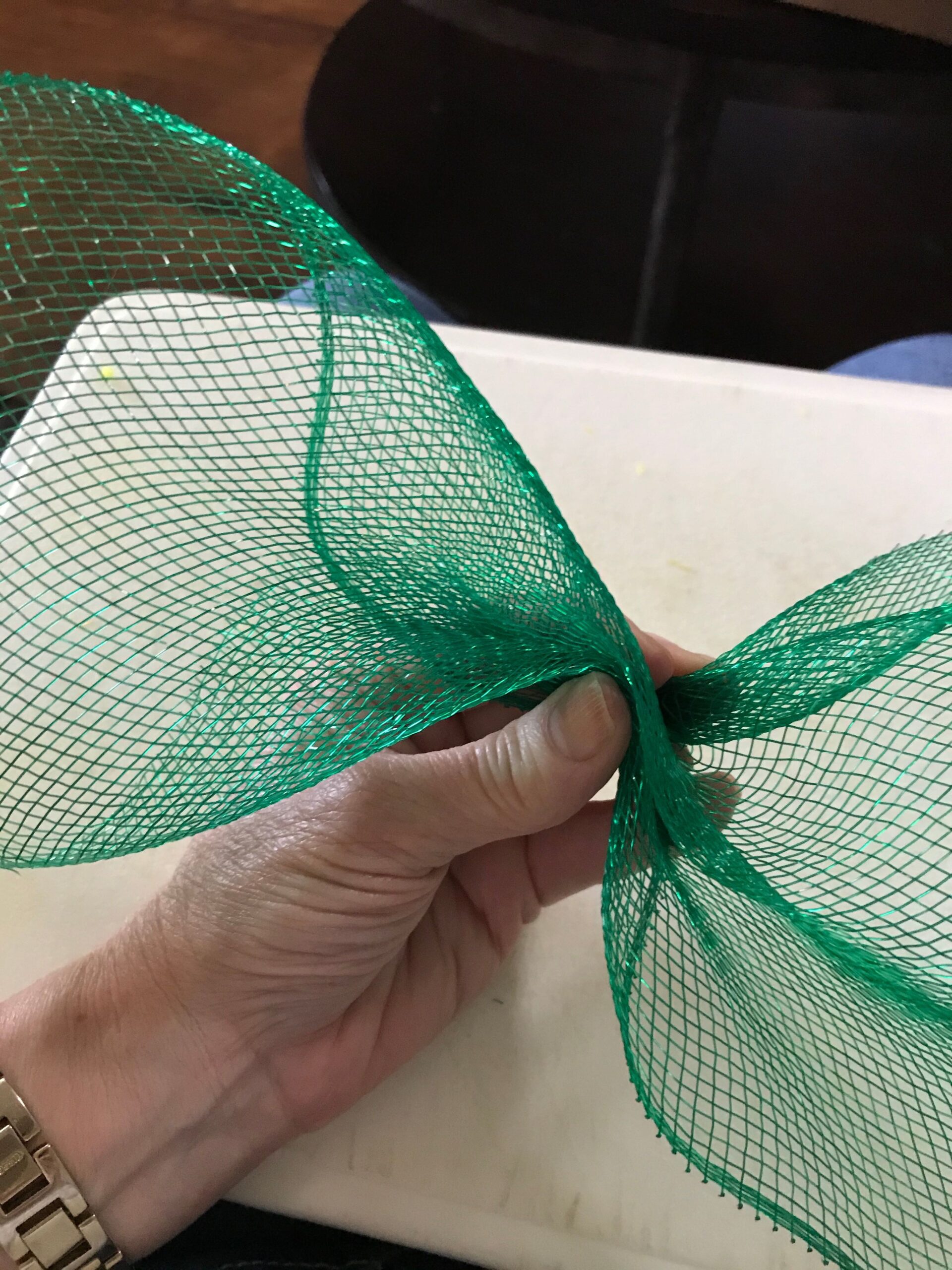 Take each 12″ strip of green mesh and bend the corner to the center. Bend the opposite corner to the center to make sort of a bow tie. Next, swinch (is that a word?) the center to gather it and wire it with a single twist to the outside wire of the wreath form. I put the folded part to the back. It doesn’t really matter. These will be your leaves.