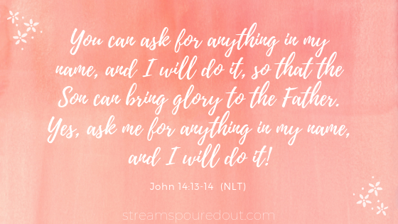 God agrees to answer our prayers because of our faith in His Son, Jesus.  We need to ask according to Jesus’ nature, His character, and because of the faith we have in Him.  We need to know who He is, truly know Him, through His word.  Then, we will desire what He desires.  When we align our prayers with Jesus, then and only then, will God listen and answer and in doing so, be glorified through His Son.  Our prayers will be for His Kingdom not our own, for His glory, not our own.