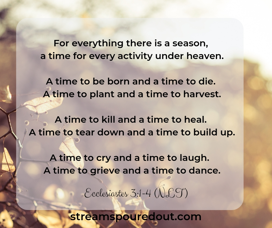 God’s not done. Singing and blossoming will come again. The sun will shine for you again. This devotional by Bonnie Gray called “Whispers of Rest” was helpful to me when I was in a season of hurting.